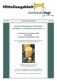 67. Jahrgang Mittwoch, 18. Juni 2025 Nummer 25 Mitteilungsblatt Vogt 2 Nr. 25 vom 18. Juni 2025 Sollte Euch kurzfristig zu einem bereits gebuchten Termin etwas dazwischenkommen, bittet doch…