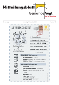 67. Jahrgang Donnerstag, 13. Februar 2025 Nummer 7 Mitteilungsblatt Vogt Amtliche Bekanntmachungen Einladung zur öffentlichen Sitzung des Gemeinderats am Mittwoch, 19. Februar 2025 um 19.00…