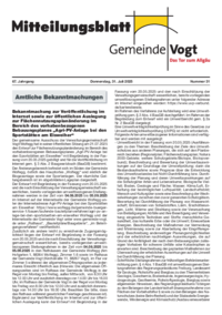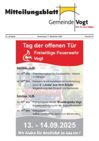 67. Jahrgang Donnerstag, 11. September 2025 Tag der offenen Tür Freiwillige Feuerwehr Vogt Samstag, 13.09. Ab 1300 Uhr Orientierungslauf für Feuerwehren, Vereine und Bürger Ab 2000 Uhr …